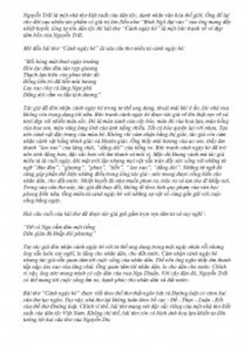 Nguyễn Trãi là một nhà thơ kiệt xuất của dân tộc, danh nhân văn hóa thế giới. Ông để lại cho đời sau nhiều tác phẩm có giá trị lớn.Nếu như “Bình Ngô đại cáo” của ông mang đầy nhiệt huyết, lòng tự tôn dân tộc thì bài thơ “Cảnh ngày hè” là một bức tranh về vẻ đẹp tâm hồn của Nguyễn Trãi.