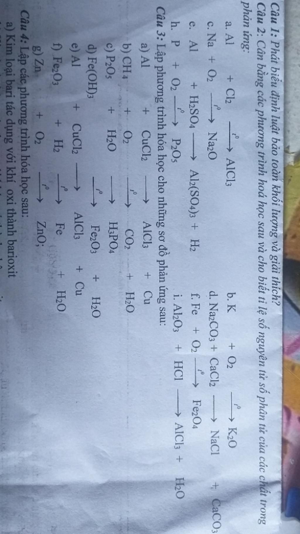 1.-Phát biểu định luật bảo toàn khối lượng: "Trong một phản ứng hóa học: Tổng khối lượng của các chất sản phẩm bằng tổng khối lượng của các chất tham gia phản ứng."
