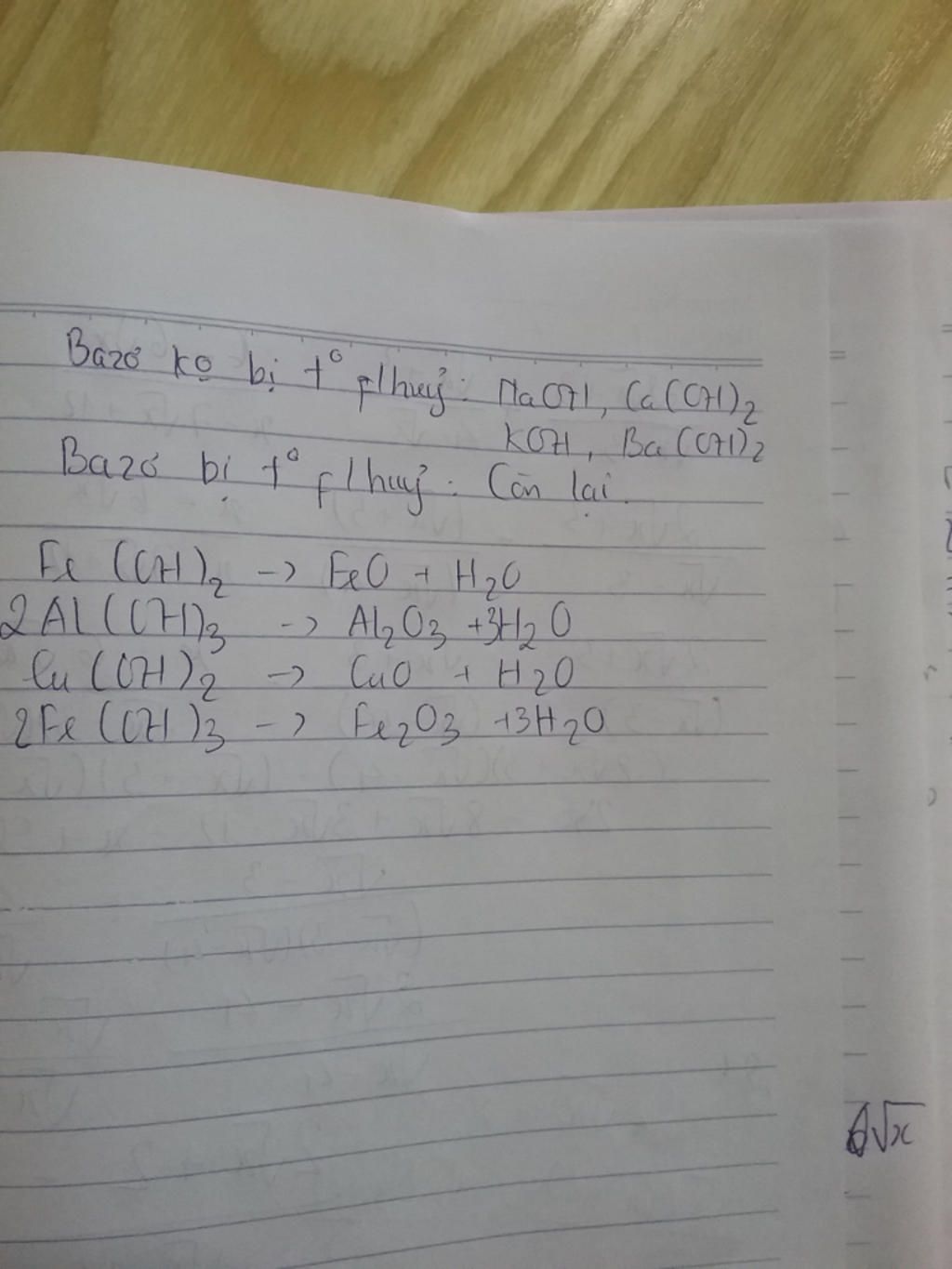 =) Bazo bị nhiệt phân hủy là: $Fe(OH_2)$,$Al(OH)_3$,$Cu(OH)_2$,$Fe(OH)_3