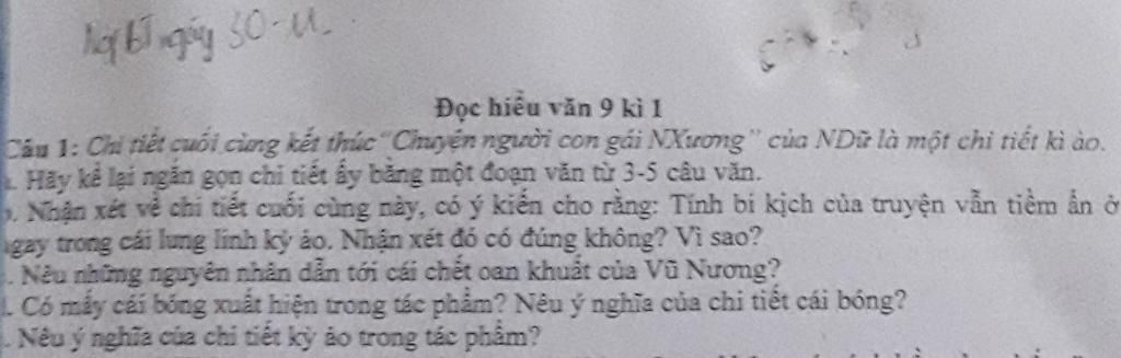 b. Qua chi tiết kì ảo ở cuối chuyện có ý kiến cho rằng " Tính bi kịch của truyện vẫn tiềm ẩn trong cái lung linh kì ảo" em hoàn toàn đồ ng ý với ý kiến đó . Vũ Nương trở về uy nghi, rực rỡ nhưng chỉ thấp thoáng, lúc ẩn lúc hiện ở giữa dòng sông rồi vĩnh viễn biến mất. Tất cả chỉ là ảo ảnh và mau chóng tan biến, nó góp phần tô đậm nỗi đau của người phụ nữ bạc mệnh. Thực tại lại trở về với thực tại: Vũ Nương vĩnh viễn không thể trở về trần gian, nàng chẳng bao giờ được làm vợ, làm mẹ như mong muốn lớn nhất của đời nàng; chàng Trương vẫn phải trả giá cho hành động phũ phàng của mình, sống trong cảnh phòng không vắng vẻ…ngồi buồn dưới ngọn đèn khuya; bé Đản mãi mãi không còn mẹ…