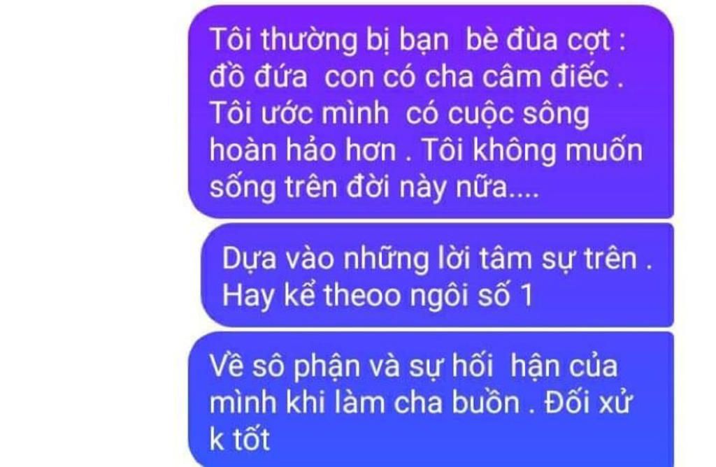 Tôi là một cô bé không được sinh ra trong hoàn cảnh tốt . Nhưng thay vào đó tôi rất vui vì luôn cảm nhận được tình yêu thương của cha mẹ dành cho mình , một sự yêu thương vô bờ bến . Nhưng khi mới tới trường tôi luôn bị bạn bè châm chọc vì có một người cha câm điếc . Bị trêu nhiều nên tôi khá xấu hổ vì điều đó , tôi đã tự hỏi tại sao mình không có một người cha bình thường như bao bạn khác . Vì bị bọn bạn nói nhiều quá vì không nhìn được nên về tôi đã lớn tiếng với cha mình . Nhưng cha tôi vẫn làm lụng vất vả để nuôi tôi nên người. Càng lớn tôi càng hiểu ra không ai thương mình hơn cha cả , cha có thể làm mọi thứ để tôi được hạnh phúc. Sau này khi bạn bè nhắc tới cha tôi thì tôi lại càng tự hào hơn không còn cảm thấy xấu hổ như trước mà thay vào đó tôi lại cảm thấy yêu cha mình hơn bởi bao vất vả mà cha phải gánh vác . Bây giờ tôi luôn yêu thương cha mình và tình cảm của cha vẫn không bao giờ là ít đối với tôi cả . Tôi chỉ muốn cha có thể một lần nghe được tôi đó là lời nói Cha ơi , con thương cha nhiều lắm
