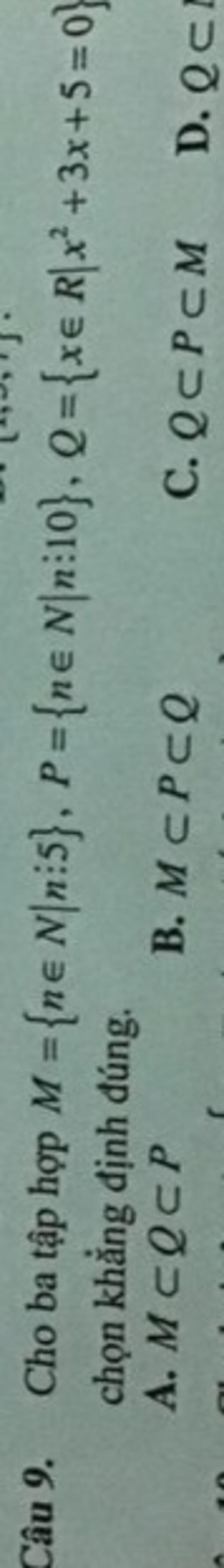 Giải thích các bước giải: \(\begin{array}{l}M = \left\{ {0;5;10;15;...} \right\}\\P = \left\{ {10;20;30;...} \right\}\\Q = \emptyset \\ \Rightarrow Q \subset P \subset M\end{array}\) Đáp án C đúng