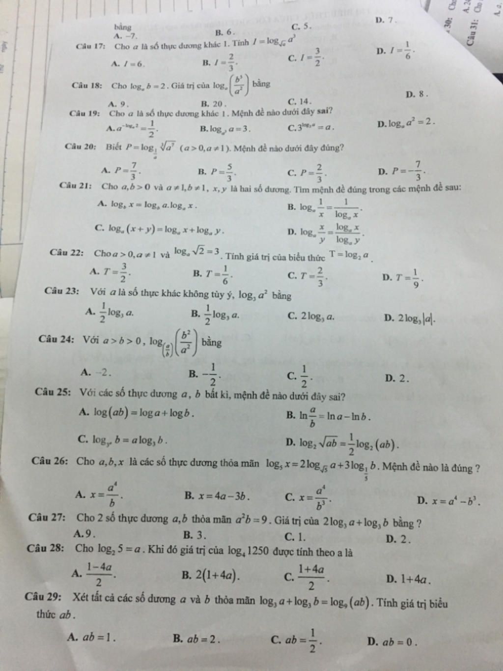 Câu 19: Cho a là số thực dương khác 1, Mệnh đề nào dưới đây sai?