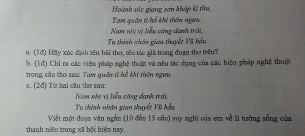 c. Trải qua hàng nghìn năm lịch sử, thanh niên Việt Nam ta vẫn kế thừa lí tưởng sống tốt đẹp muốn cống hiến cho đất nước. Chính phủ đang khuyến khích thanh niên sáng tạo, chạy đua với nước bạn trong thị trường chất xám nhằm rút ngắn hơn khoảng cách hiện đại hóa xã hội. Hàng trăm cuộc thi sáng tạo ra đời nhằm thúc đẩy tư duy sáng chế, vận dụng lí thuyết, đưa sáng chế ấy ra trường quốc tế để nâng cao vị thế của Việt Nam. Hơn trăm đấu trường trí tuệ được tổ chức hàng năm cũng nhằm mục đích ấy. Không dừng lại ở đó, các cuộc thi thể thao cũng ra đời cũng góp phần tạo lí tưởng sống cao đẹp cho thanh niên Việt Nam. Những thanh niên Việt với nhiệt huyết sục sôi đã và đang cố gắng đem sức mình góp cho non sông. Không mệt mỏi và luôn sáng tạo chính là họ - thanh niên nước Việt Nam anh hùng. Lí tưởng sống của mỗi người mỗi khác nhau, có người thích lớn lao cao cả, có người lại thích nho nhỏ vừa sức. Nhưng chung quy, lí tưởng sống phải luôn tốt đẹp và có ích cho xã hội, cho đất nước và đại bộ phận thanh niên Việt Nam hiện nay đã từng bước hoàn thiện bản thân và hướng đến mục đích ấy. Vậy còn bạn, lí tưởng sống của bạn là gì?