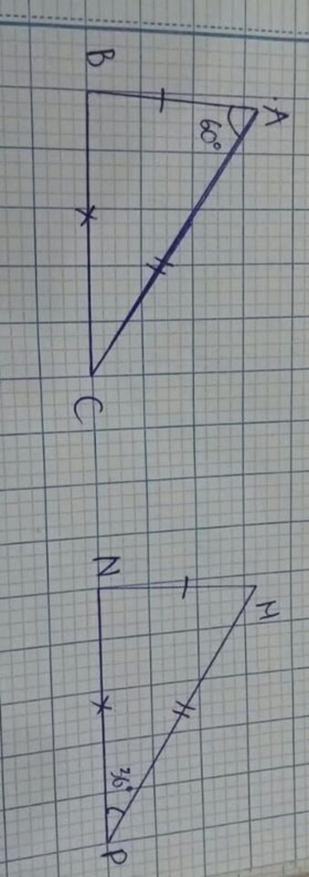 Ta có Góc A = Góc M = 60 độ ( 2 cặp góc tương ứng )