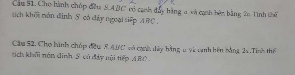 51) $V_{nón} = \dfrac{a^3\pi\sqrt{33}}{27}$