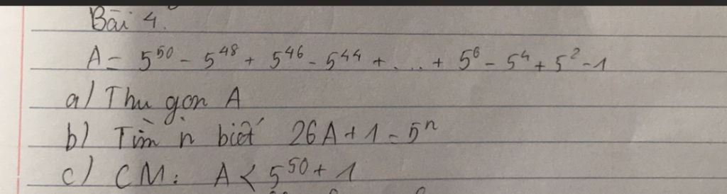\Leftrightarrow 25A = {5^2}{.5^{50}} - {5^2}{.5^{48}} + {5^2}{.5^{46}} - {5^2}{.5^{44}} + .... + {5^2}{.5^6} - {5^2}{.5^4} + {5^2}{.5^2} - {5^2}.1\\