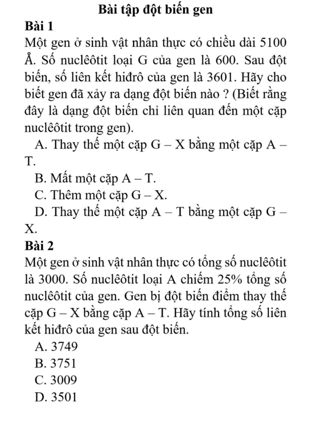 Gen bị đột biến thay cặp G-X bằng cặp A-T => số liên kết giảm đi 1