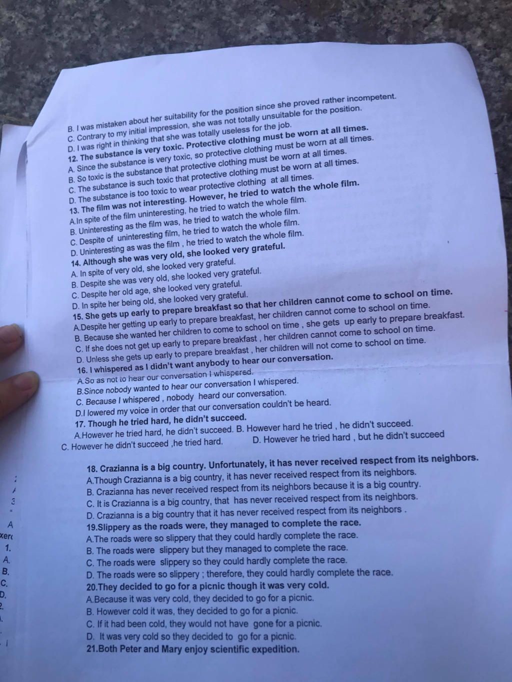13. B. uninteresting as the film was, he tried to watch the whole film.