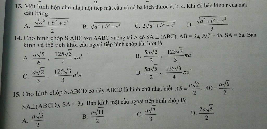 13. Một hình hộp chữ nhất nội tiếp mặt cầu và có ba kích thước a, b, c. Khi đó bán kính r của mặt