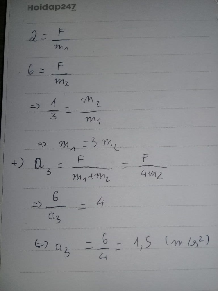 Ta có: a=$\frac{F}{m1+m2}$ =$\frac{F}{3m2 +m2}$ =$\frac{F}{4m2}$ (2).