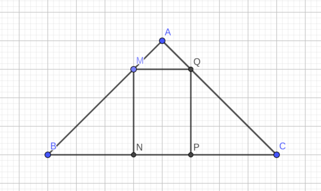 $\begin{split}\rightarrow S_{MNPQ}&=S_{ABC}-S_{MNB}-S_{CPQ}\\&=S_{ABC}-S_{AMQ}-2S_{MNB}\\&=\dfrac{1}{2}AB^2-\dfrac{1}{2}AM^2-MN^2\\&=\dfrac{1}{2}AB^2-\dfrac{1}{2}AM^2-\dfrac{1}{2}MB^2\\&=\dfrac{1}{2}AB^2-\dfrac{1}{2}.(AM^2+BM^2)\\&\le \dfrac{1}{2}AB^2-\dfrac{1}{4}.(AM+MB)^2\\&=\dfrac{1}{2}AB^2-\dfrac{1}{4}.AB^2\\&=\dfrac{1}{4}AB^2=162\end{split}$
