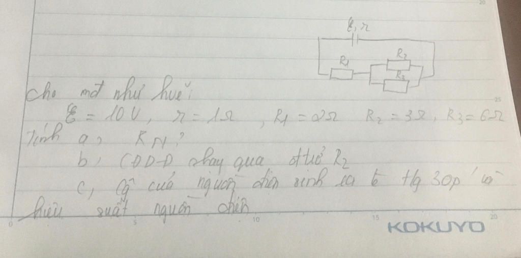 c. Công của nguồn điện trong 30 phút và hiệu suất của nguồn là: