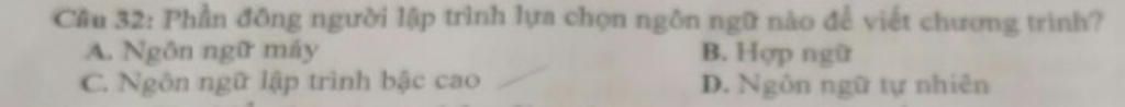 *Đáp án C : ngôn ngữ lập trình bậc cao - thường hỗ trợ hệ thống thư viện, giúp người lập trình tập trung vào logic hơn là các chi tiết máy tính