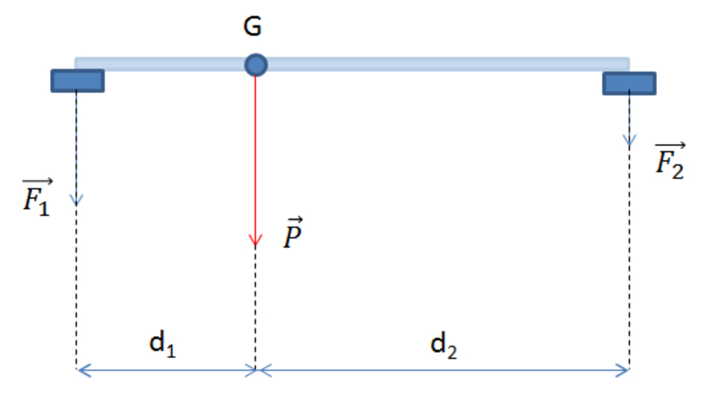 Gọi \(\overrightarrow {{F_1}} ,\overrightarrow {{F_2}} \) lần lượt là lực mà tấm ván tác dụng lên điểm tựa trái và điểm tựa phải.