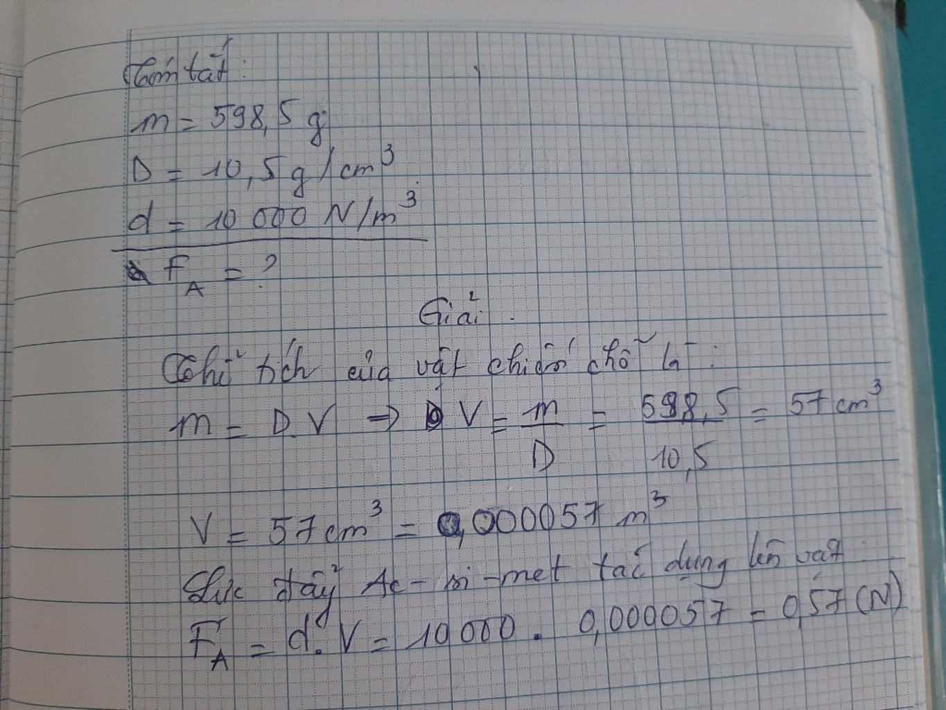Độ lớn lực đẩy Acsimet tác dụng lên vật: