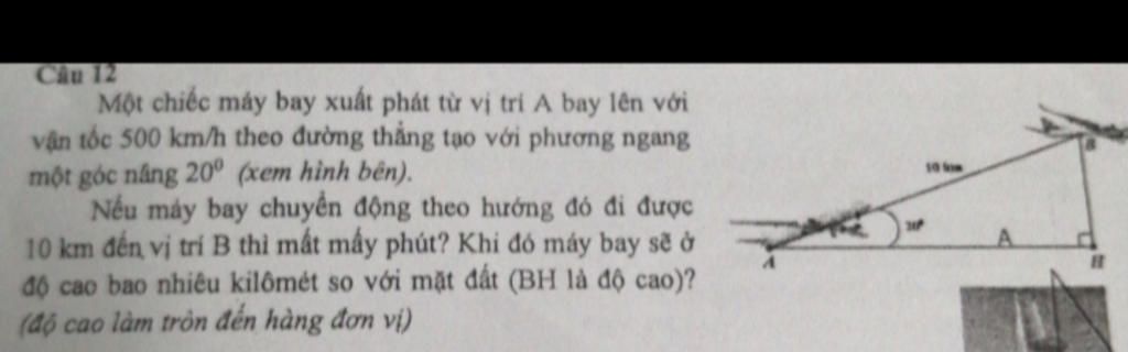 Một chiếc máy bay xuất phát từ vị trí A bay lên với vận tốc 500 km/h theo đường thẳng tạo với phương ngang một góc nâng 20° (xem hình bên). Nếu máy bay chuyển động theo hướng đó đi được 10 km đến vị trí B thì mất mấy phút? Khi đó máy bay sẽ ở độ cao bao nhiêu kilômét so với mặt đất (BH là độ cao)?