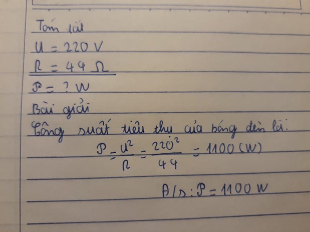 $P=\dfrac{U^2}{R}=\dfrac{220^2}{44}=1100W$
