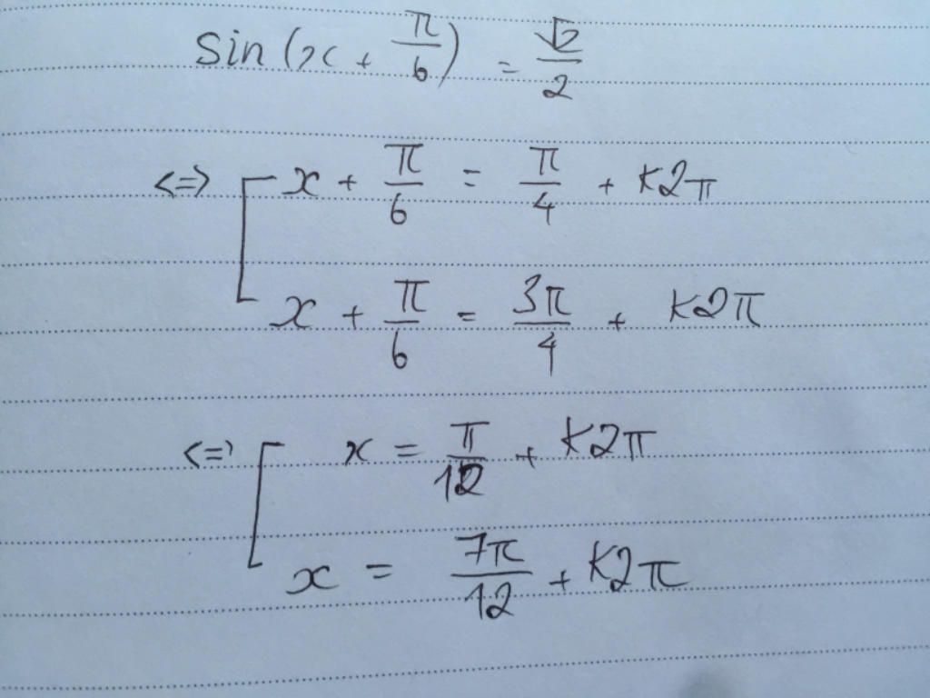 $\begin{array}{l}\sin\left(x + \dfrac{\pi}{6}\right) = \dfrac{\sqrt2}{2}\\ \Leftrightarrow \sin\left(x + \dfrac{\pi}{6}\right) = \sin\dfrac{\pi}{4}\\ \Leftrightarrow \left[\begin{array}{l}x + \dfrac{\pi}{6} = \dfrac{\pi}{4} + k2\pi\\x + \dfrac{\pi}{6} = \dfrac{3\pi}{4} + k2\pi\end{array}\right.\\ \Leftrightarrow \left[\begin{array}{l}x = \dfrac{\pi}{12} + k2\pi\\x = \dfrac{7\pi}{12} + k2\pi\end{array}\right.\quad (k \in \Bbb Z)\\ \text{Vậy phương trình có họ nghiệm là:}\\ x = \dfrac{\pi}{12} + k2\pi \quad \text{và}\quad x = \dfrac{7\pi}{12} +k2\pi\quad \text{với}\quad k \in \Bbb Z \end{array}$