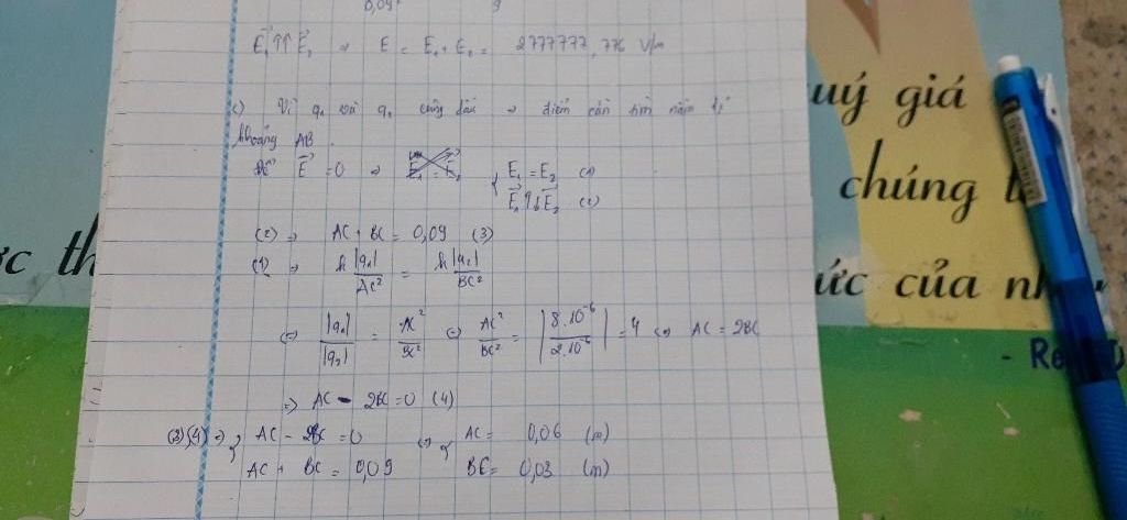 Để xảy ra $(2)$ thì $\dfrac{k.|q_1|}{AM^2}=$ $\dfrac{k.|q_2|}{BM^2}$