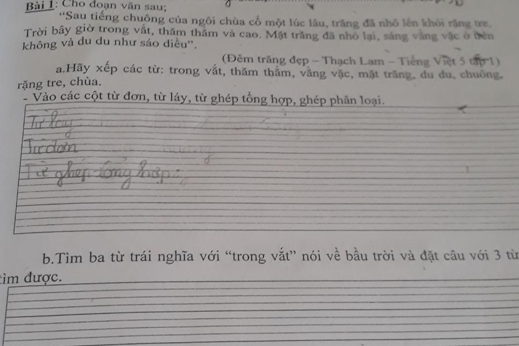 từ ghép phân loại : trong vắt , mặt trăng , rặng tre