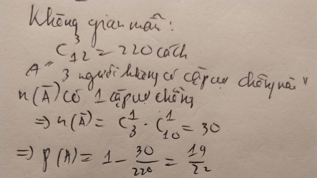Không gian mẫu là chọn 3 người từ 6 cặp nam nữ là \(C_{12}^3 = 220\) cách