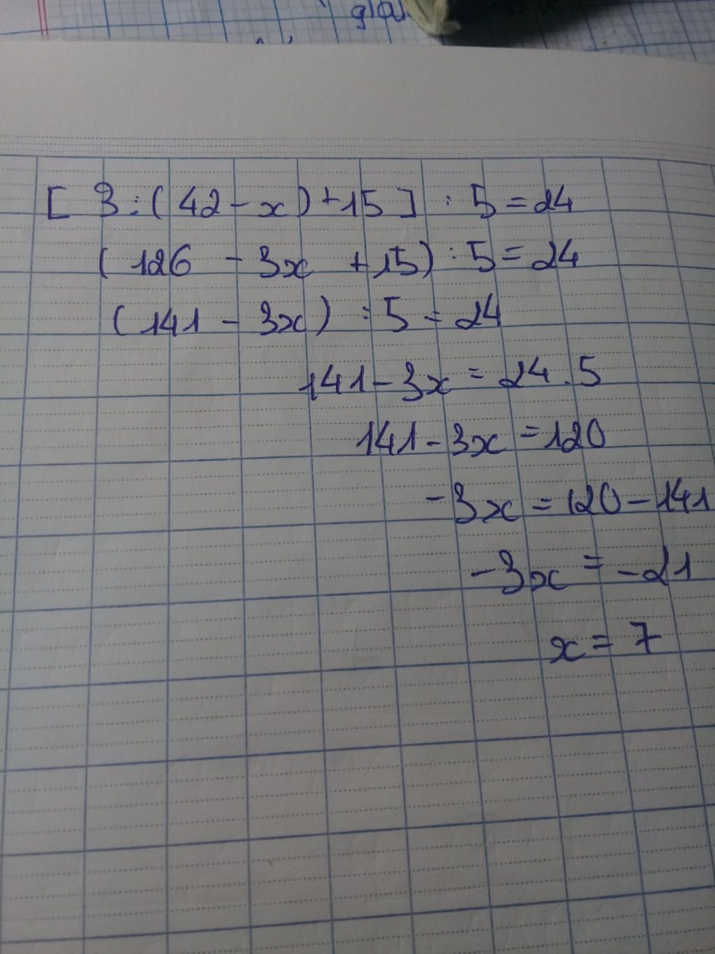 $\text{[3.(42 - x) + 15] ÷ 5 = 24.}$