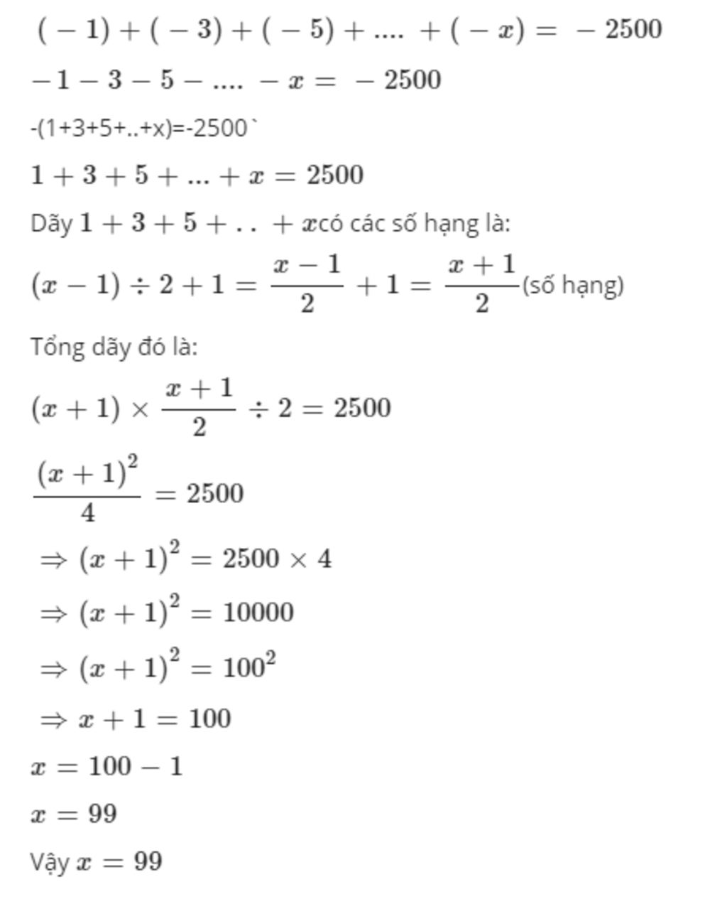 Giải thích các bước giải:(x-1)+(x-3)+(x-5)+.....+(x-)+2500=>(X+X+X+X+...+X)-(1+3+5+.....)=-2500