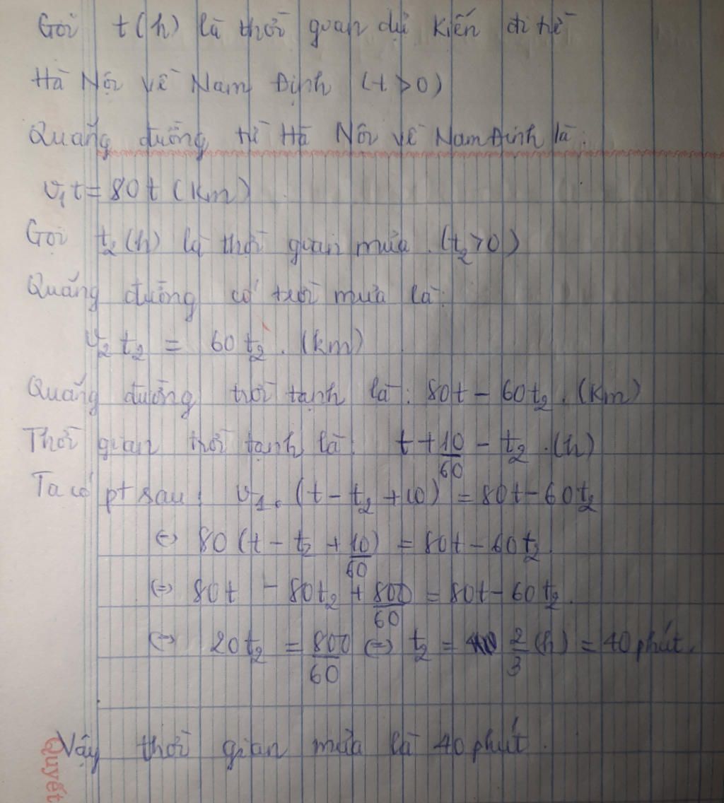 Thời gian đi nếu không mưa là: \(t = \dfrac{s}{{80}}\)