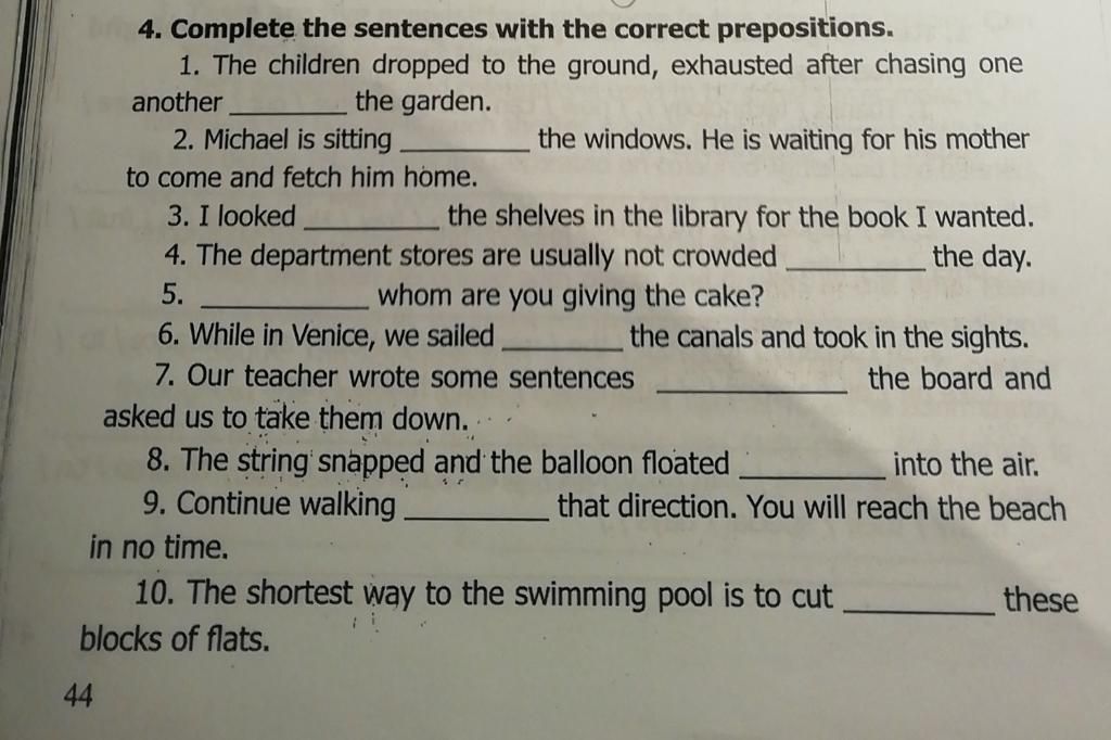 10. The shortest way to the swimming pool is to cut........these blocks of flats.