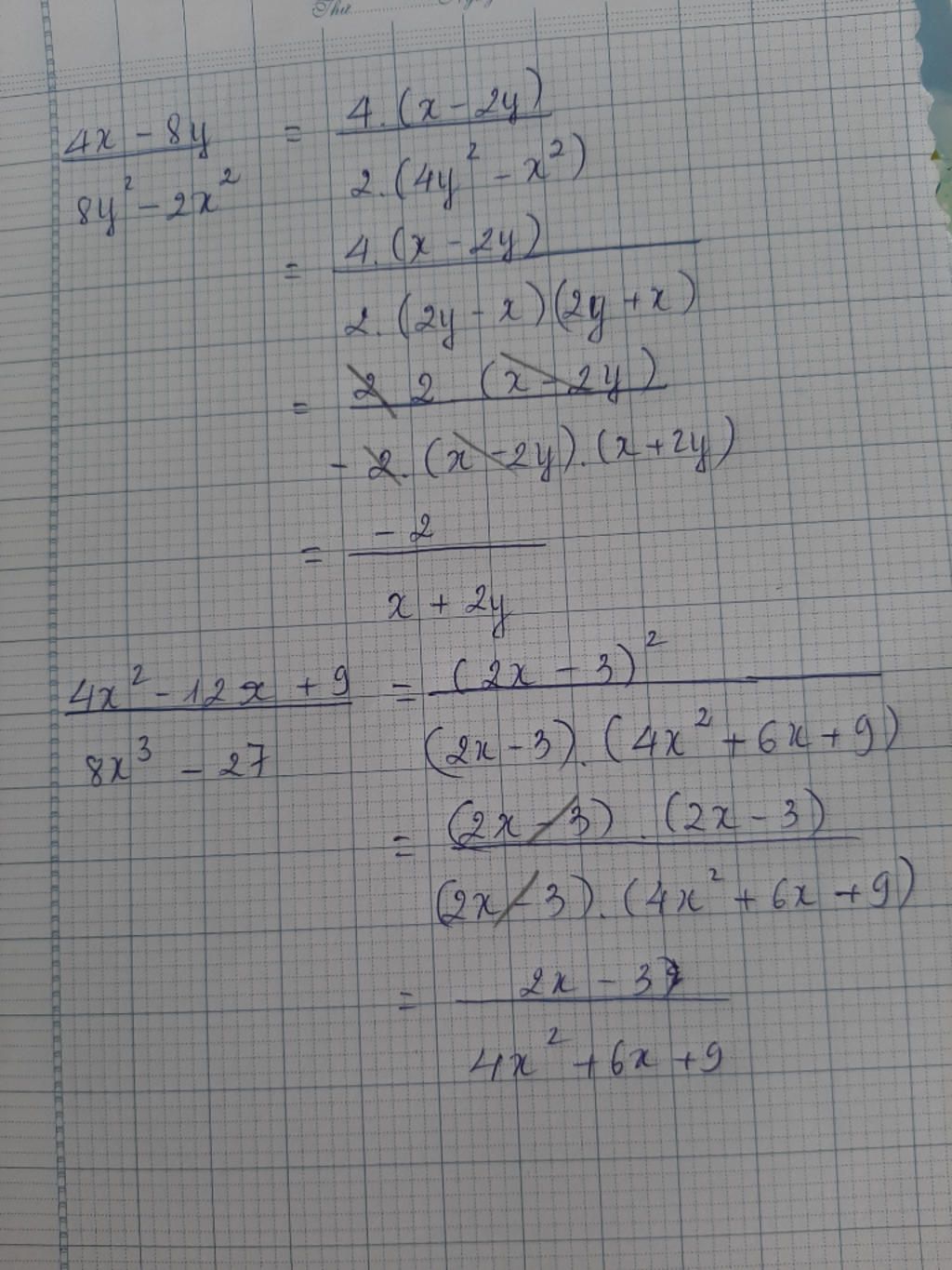 `(4x^2 - 12x + 9) / (8x^3 - 27)=((2x-3)^2)/((2x-3)(4x^2+6x+9))=(2x-3)/(4x^2+6x+9)`