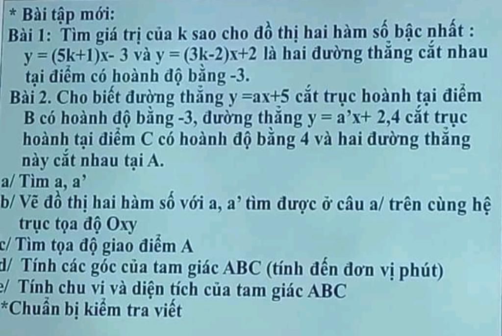 Bài 1: Tìm giá trị của k sao cho đồ thị hai hàm số bậc nhất :