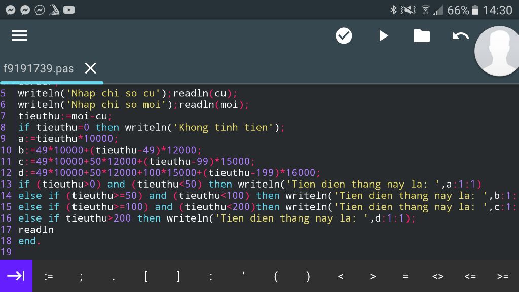 if (tieuthu>0) and (tieuthu<50) then writeln('Tien dien thang nay la: ',a : 1 : 1)