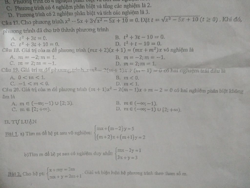 Câu 17. Cho phưong trình x2 -5x + 3vx2-5x +10 = 0. Đặt t= Vx-5x +10 (t2 0). Khi đó,