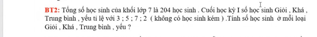 Đáp án:Gọi số học sinh giỏi, khá ,yếu,trung bình, kém lần lượt là a,b,c,d(học sinh)(a,b,c,d∈N*)