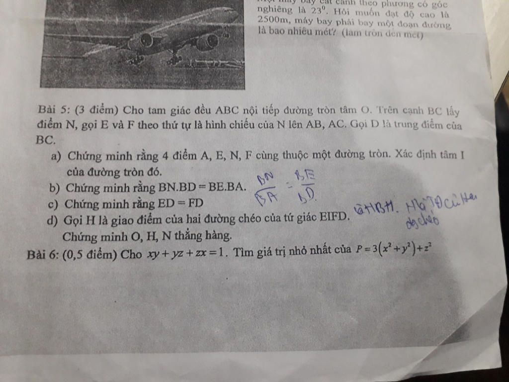Bài 5: (3 điểm) Cho tam giác đều ABC nội tiếp đưong tròn tâm O. Trên canh BC lấy