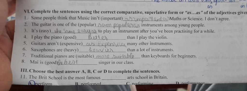 VI. Complete the sentences using the correct comparative, superlative form or "as...as" of the adjectives give