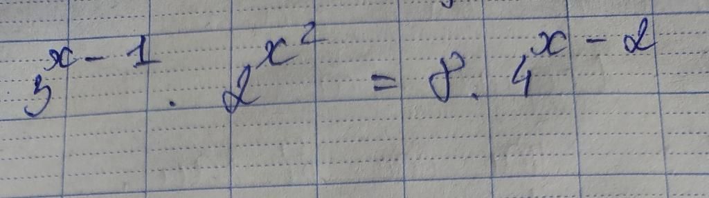 `3^{x - 1}.2^{x^{2}} = 8.4^{x - 2}`