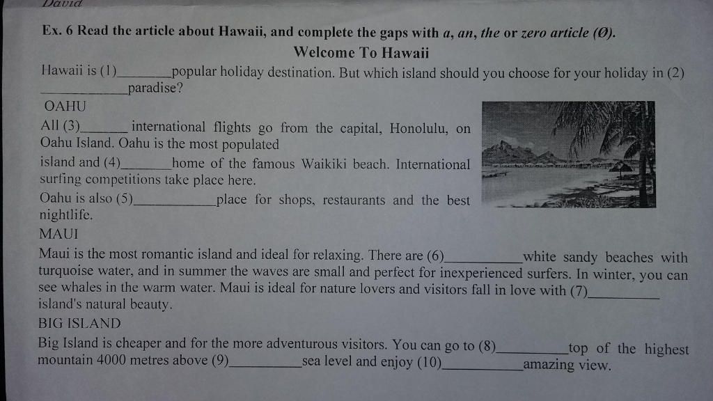 Ex. 6 Read the article about Hawaii, and complete the gaps with a, an, the or zero article (Ø).