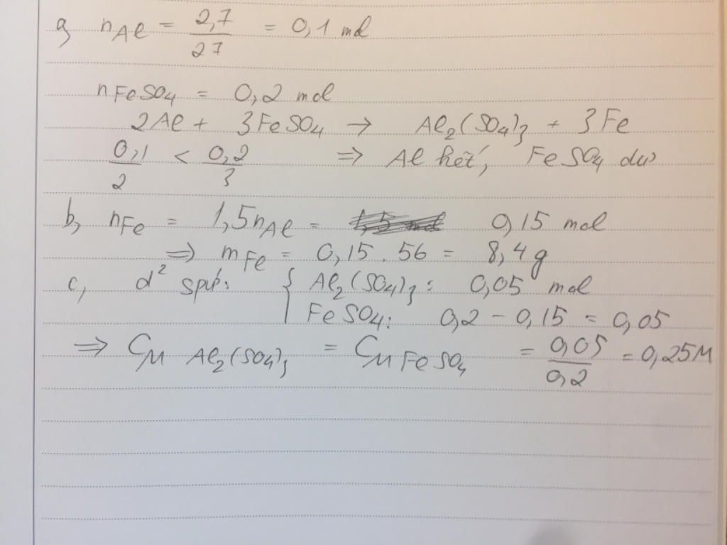 `⇒FeSO_4` dư, `Al` phản ứng hết , tính theo `Fe`