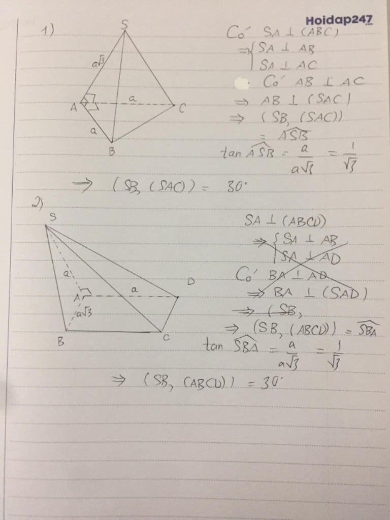 2. Cho hình chóp SABCD có đáy là hình chữ nhật, AB= a căn 3, AD=a, SA =a, SA vuông góc với mặt đáy. Số đo giữa SB và mp (ABCD) là ?