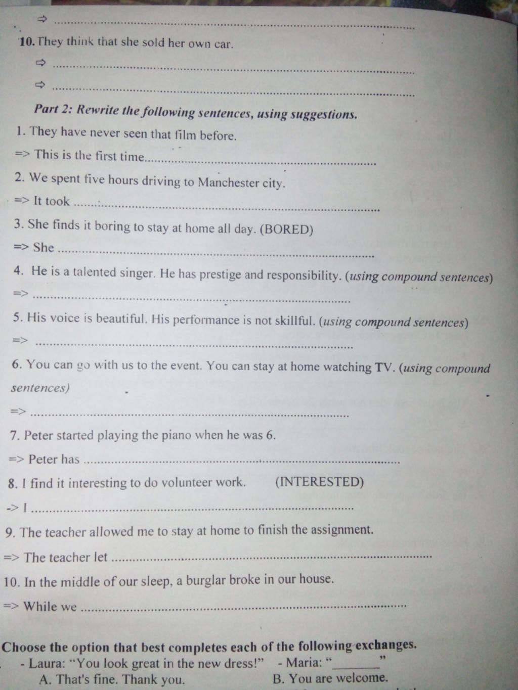 9. The teacher let me stay at home to finish the assignment. ( let someone V1 : cho phép )