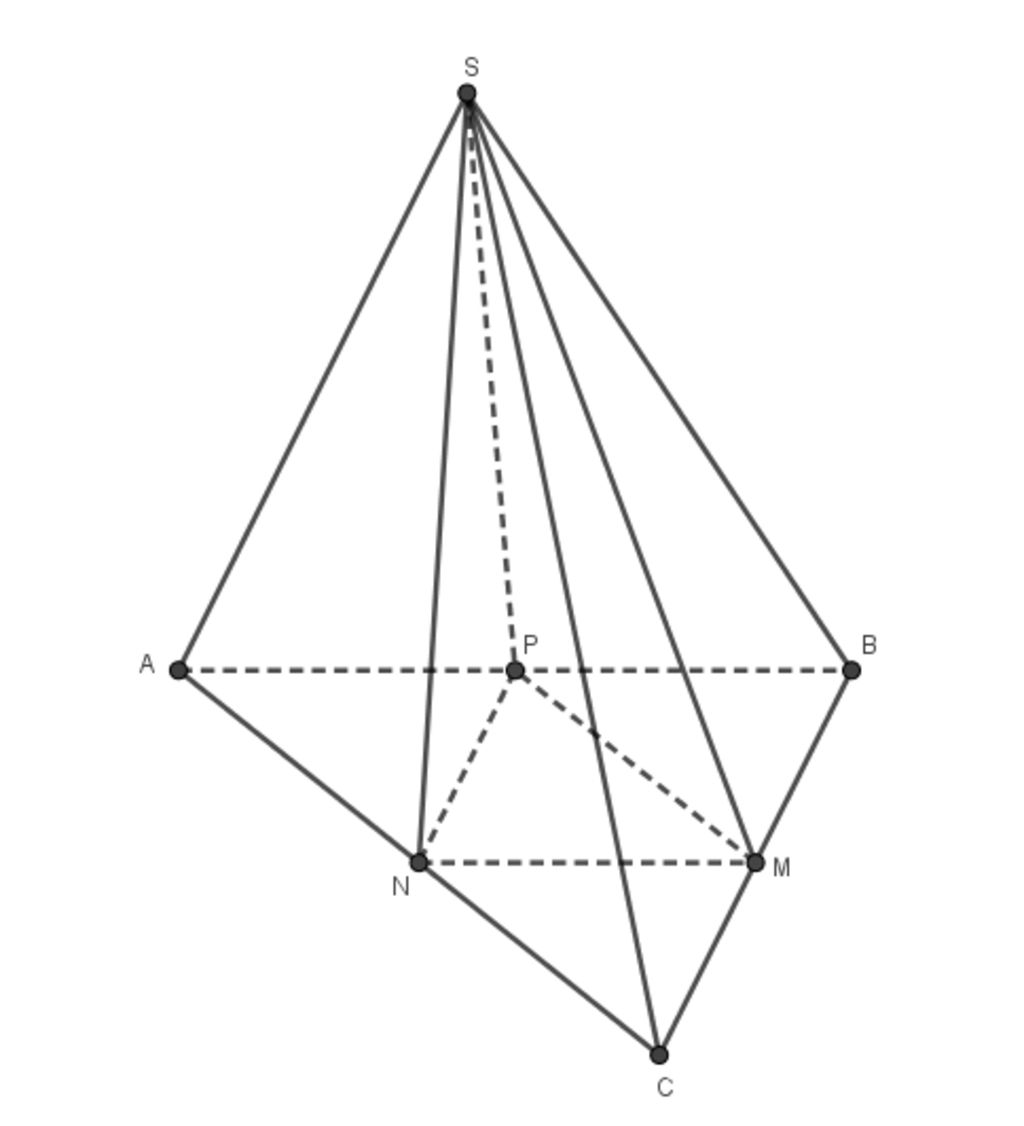 $\to \dfrac{1}{3}S_{MNP}.d(S;(MNP)) =\dfrac{1}{3}\cdot\left(\dfrac14S_{ABC}\right).d(S;(ABC))$