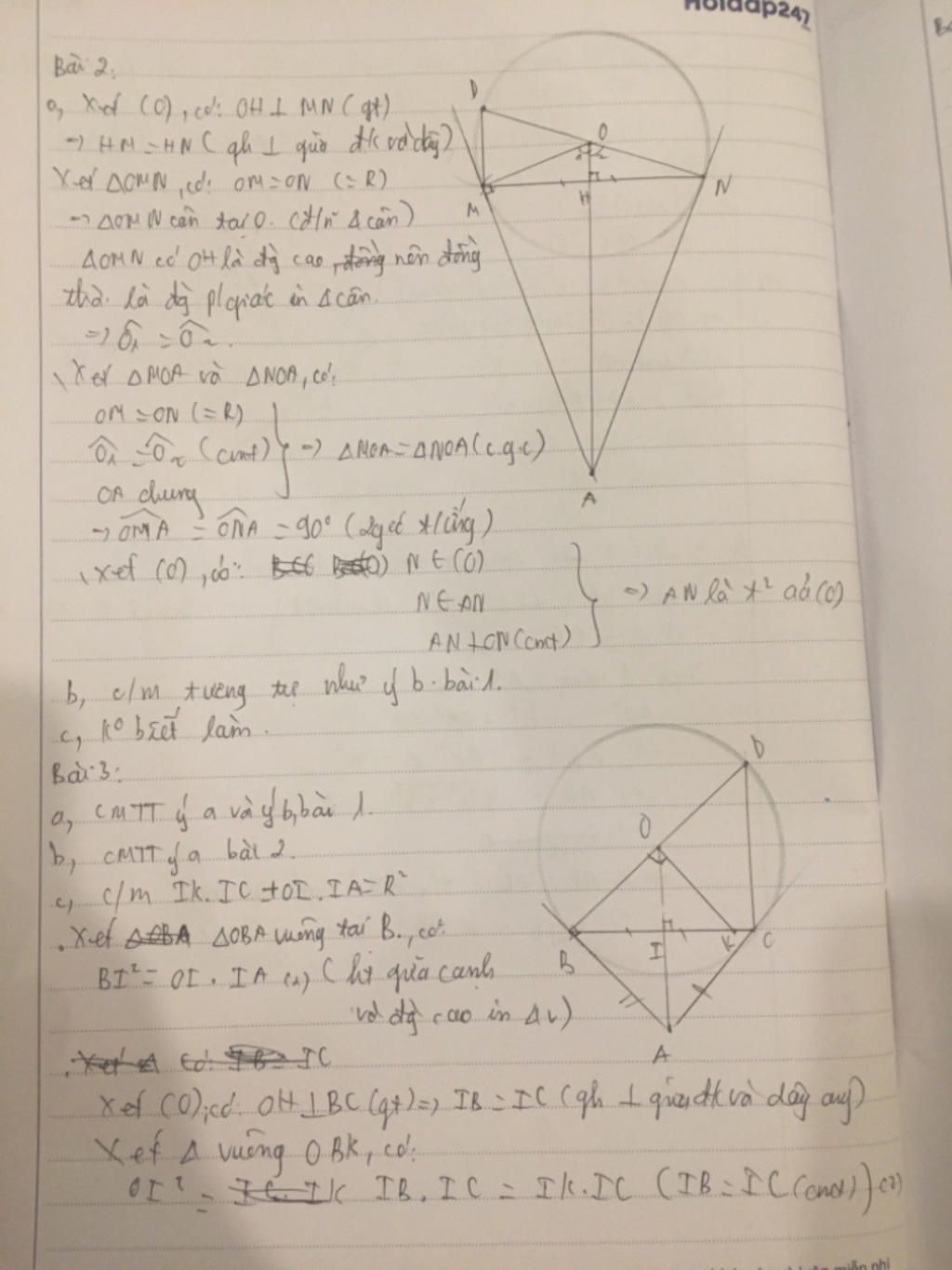 Bài 2: Cho đường tròn (O;R) dây MN khác đường kính. Qua O kẻ đường vuông góc với MN tại H, cắt các tiếp tuyến tại M của đường tròn tại điểm A