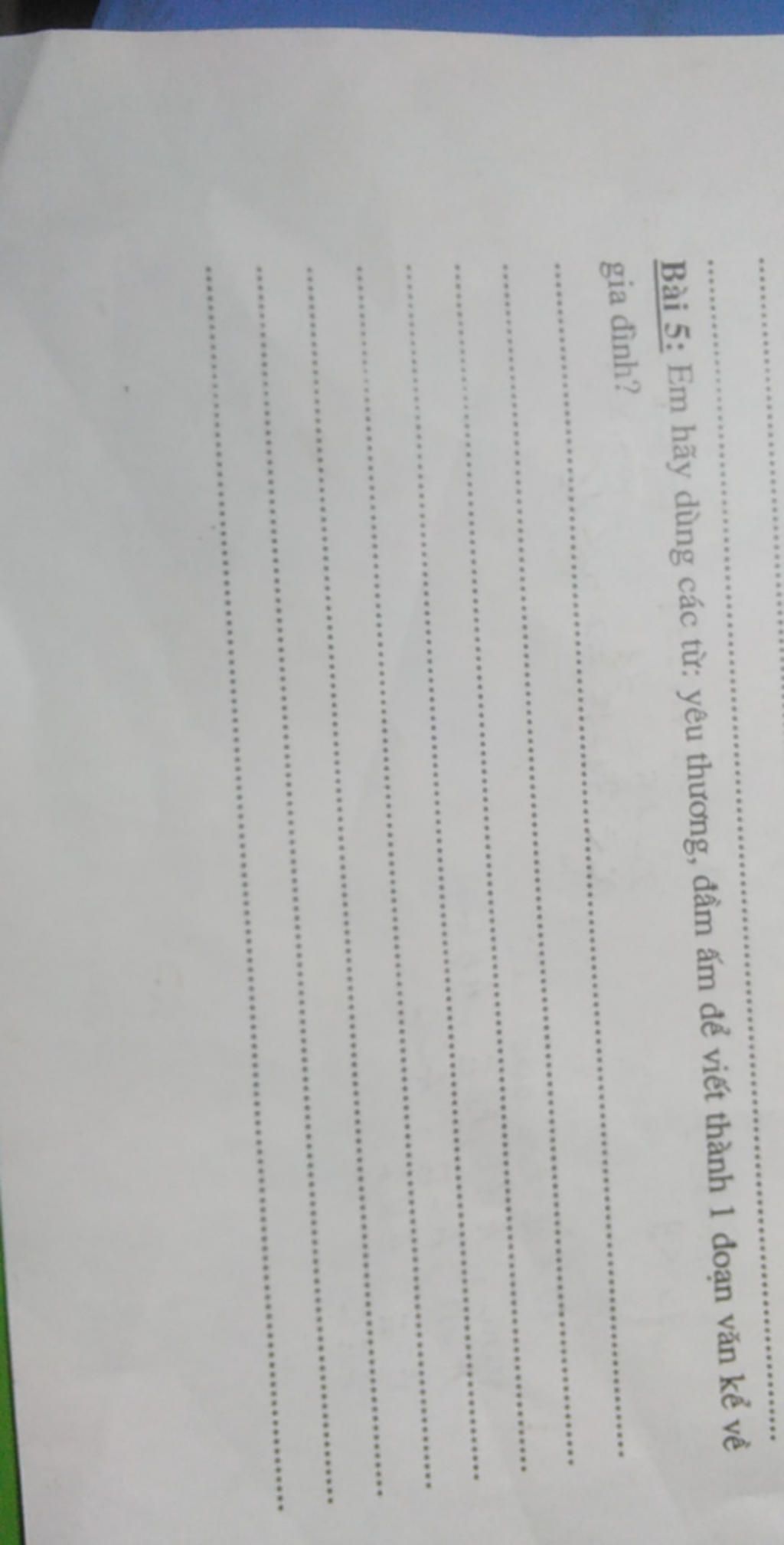 gia đình em có có 5 người ông,bà,bố,mẹvà em.ông em năm nay 62 tuổi làm nghề phô tô.bà em năm nay 61 tuổi làm nghề y tá nay đã nghỉ hưu.bố em năm nay 35 tuổi làm một luật sư.mẹ em năm nay 33 tuổi làm giáo viên.em năm nay 7 tuổi em học ở trường bàng la.em có em ruột tên là diệp anh năm nay 2 tuổi học ở trường măũ giáo.gia đình em rất yêu thương em,lúc nào gia đình bảo vệ em.em thấy gia đình rất đầm ấm làm sao.nên em sẽ có gắng chăm chỉ học tập