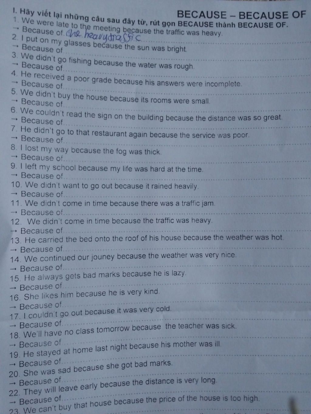 I.Hãy viết lại những câu sau đây từ rút gọn because thành because of