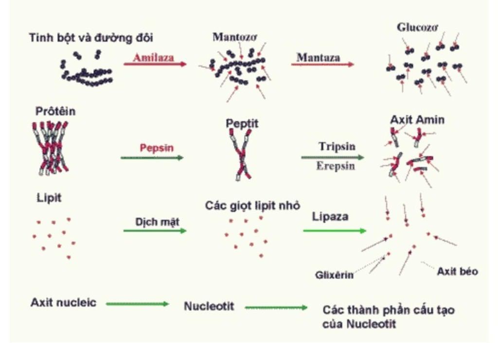 - Biến đổi hóa học: sự phân cắt các đại phân tử thức ăn thành các phân tử chất dinh dưỡng .(chi tiết các phân tử thứ ăn bị biến đổi thành phân tử gì:dưới ảnh)