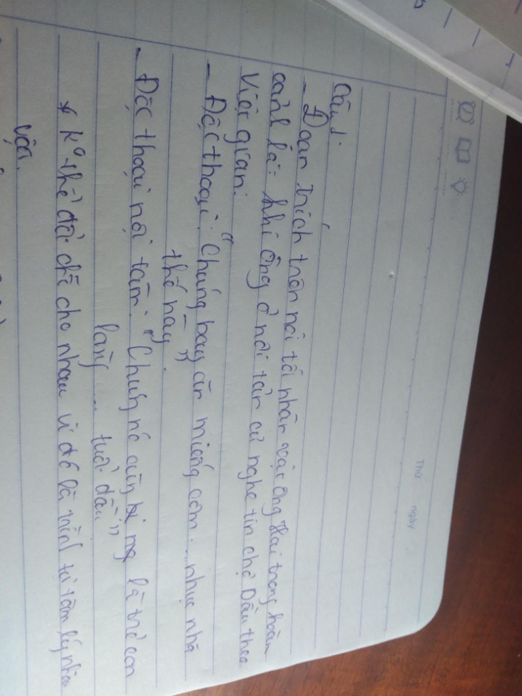 `-`Độc thoại: "Chúng bay ăn miếng cơm hay miếng gì vào mồm mà đi làm cái giống Việt gian bán nước để nhục nhã thế này.” ( vì ông Hai nói thành câu nhưng cũng có thể tính là độc thoại nội tâm)