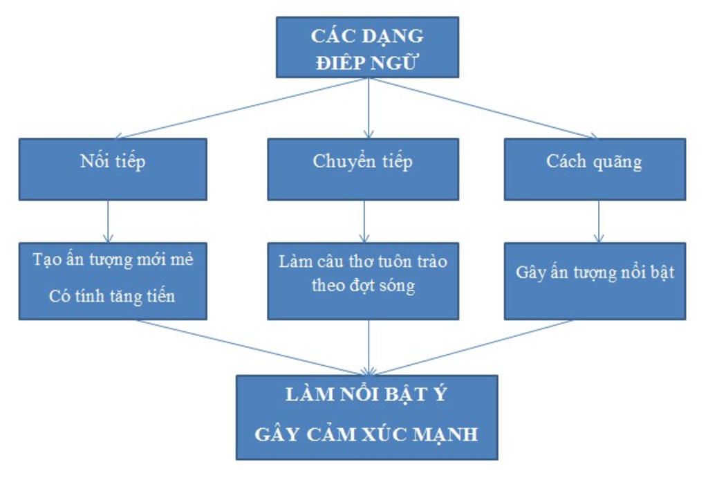 ⇒ Điệp ngữ có nhiều dạng: điệp ngữ cách quãng, điệp ngữ nối tiếp, điệp ngữ chuyển tiếp (điệp ngữ vòng).