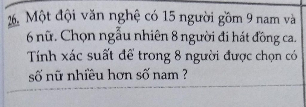 Chọn ngẫu nhiên 8 người có $C_{15}^8$ cách.